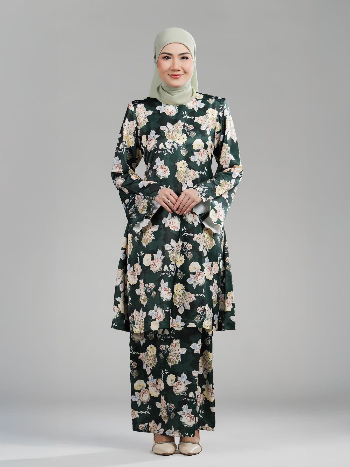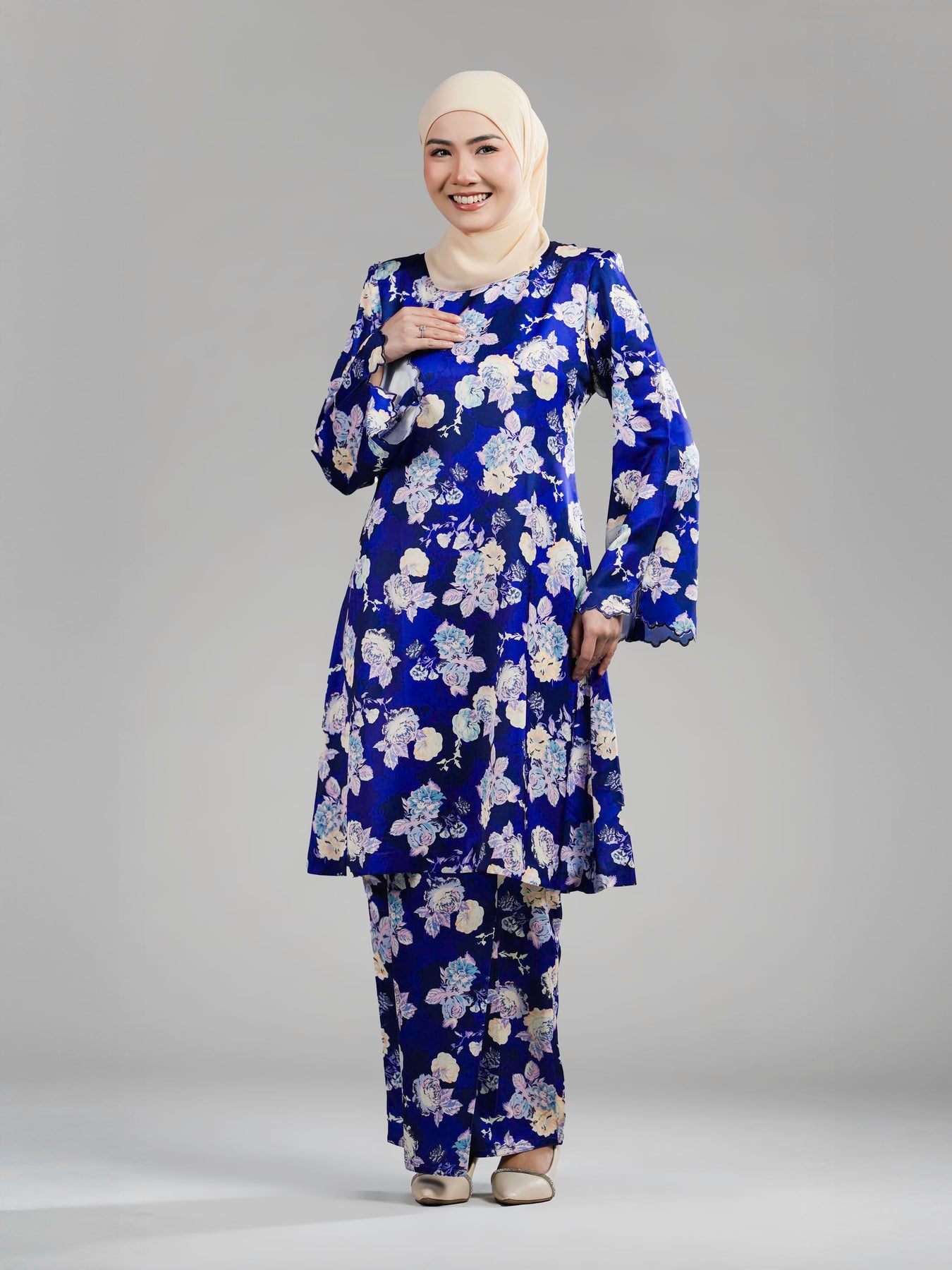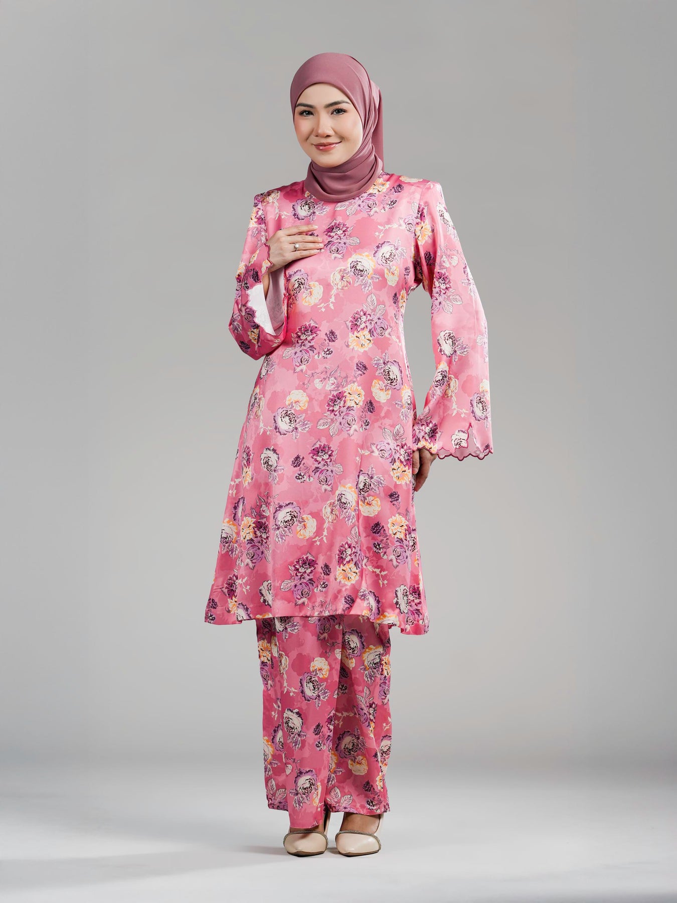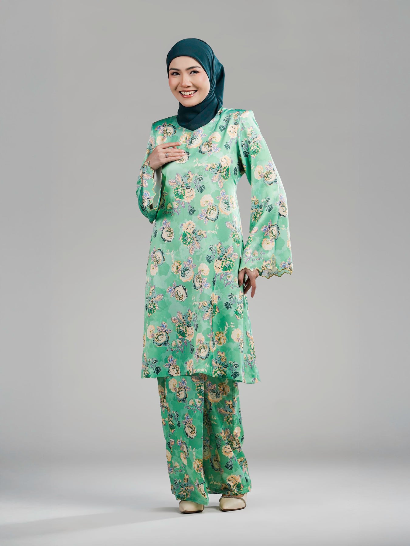 Sentuhan sulaman biku tiga di hujung lengan menambah nilai tradisional yang halus, manakala kain bawahan potongan kipas tepi memberi ruang pergerakan yang selesa dan siluet yang lebih anggun. Keseluruhan rekaan menyerlahkan keseimbangan antara rekaan kontemporari, perincian eksklusif dan keselesaan premium.