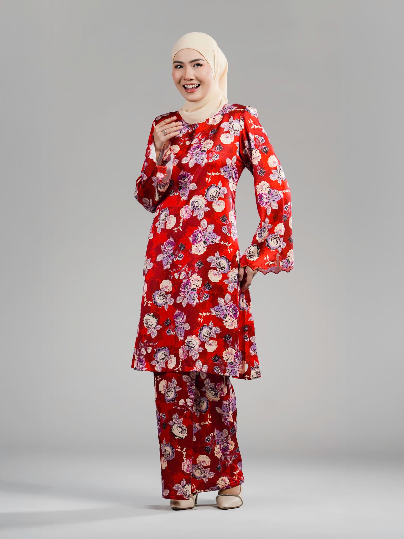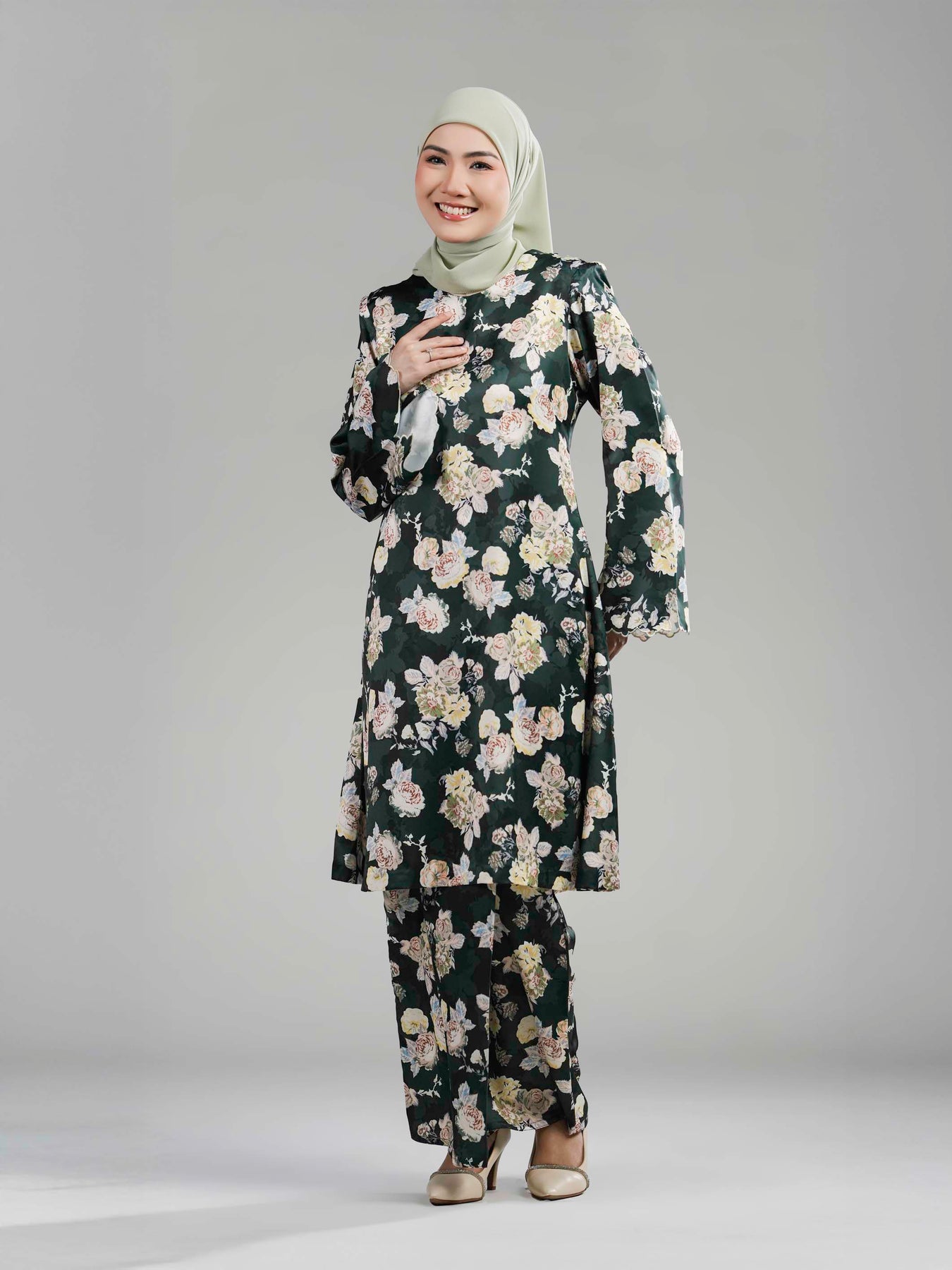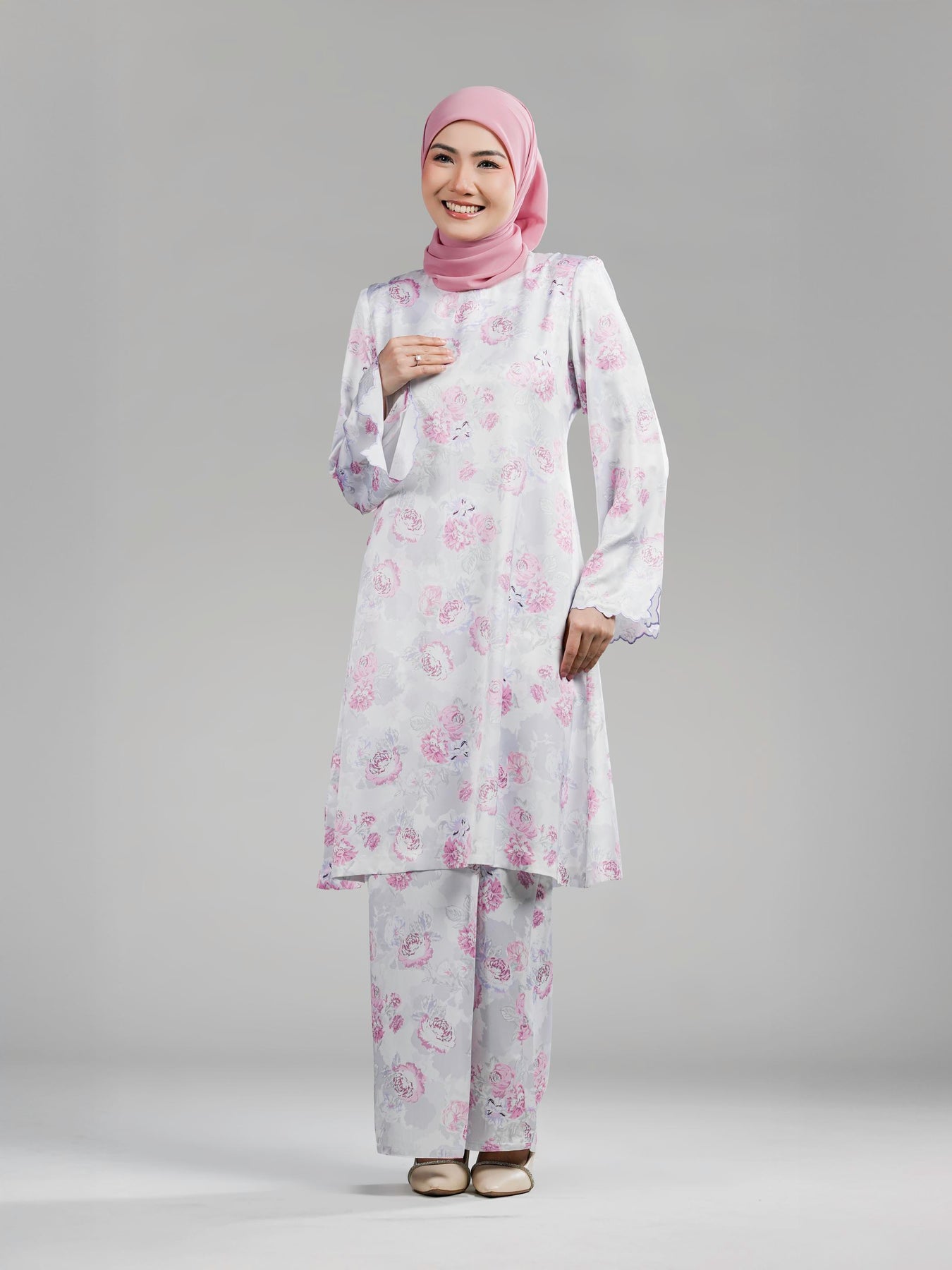 Keistimewaan koleksi ini terletak pada corak bunga ros bersaiz besar yang dicetak menggunakan empat tona warna bagi membentuk visual bunga yang lebih hidup, eksklusif dan menawan. Baju Kurung ini hadir dengan potongan moden berstruktur kemas, dilengkapi kolar bulat yang ringkas serta zip di bahagian belakang untuk kemudahan pemakaian.