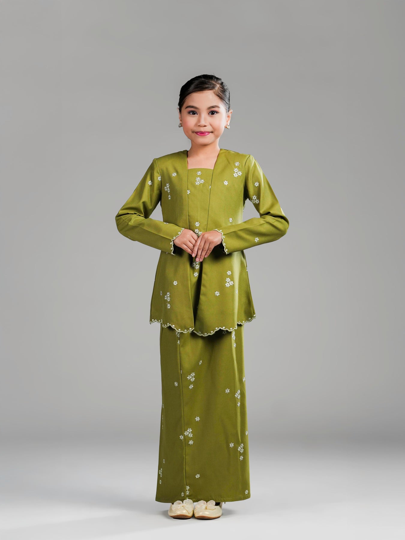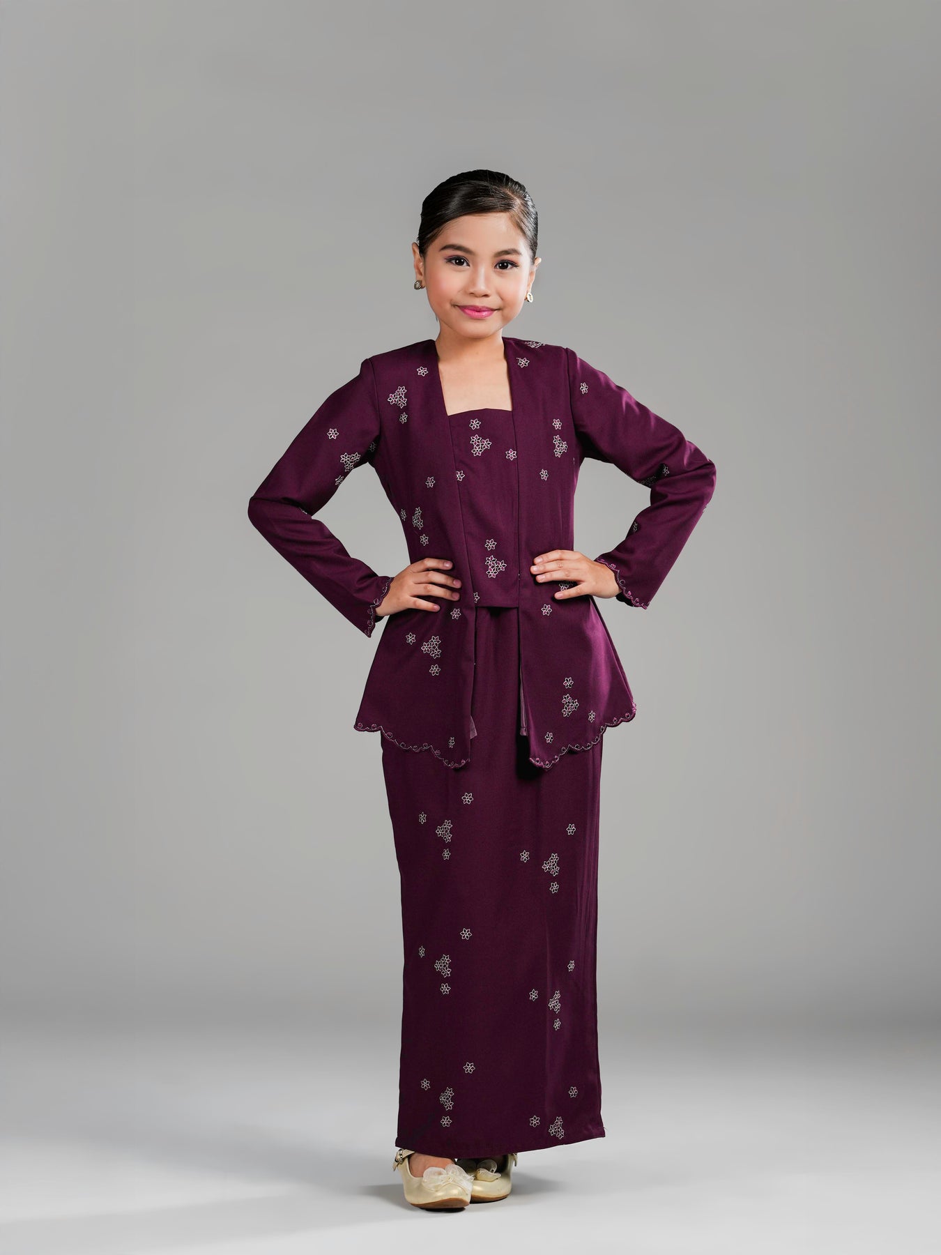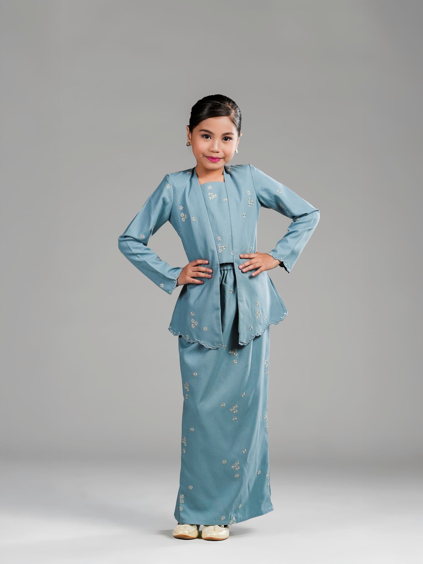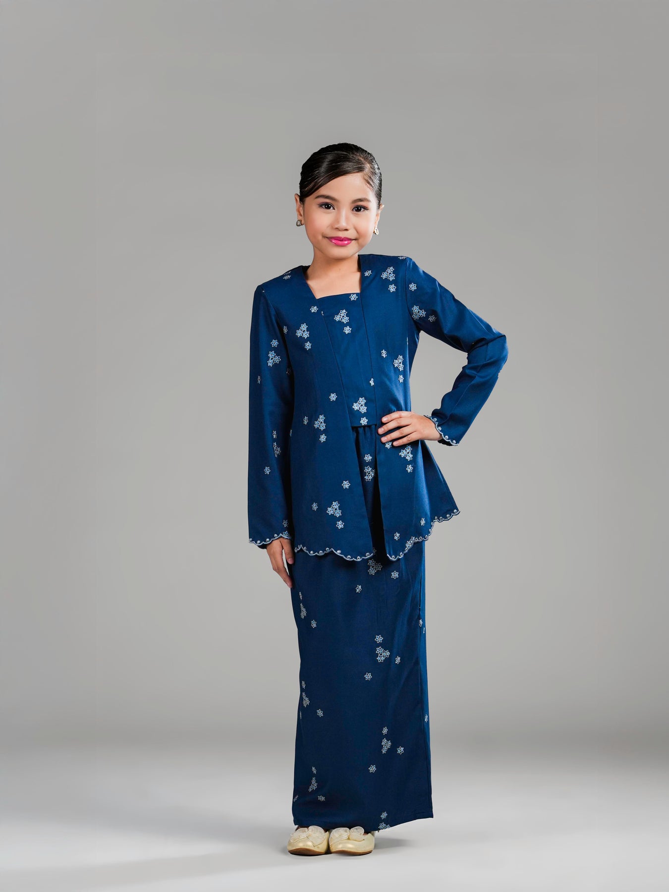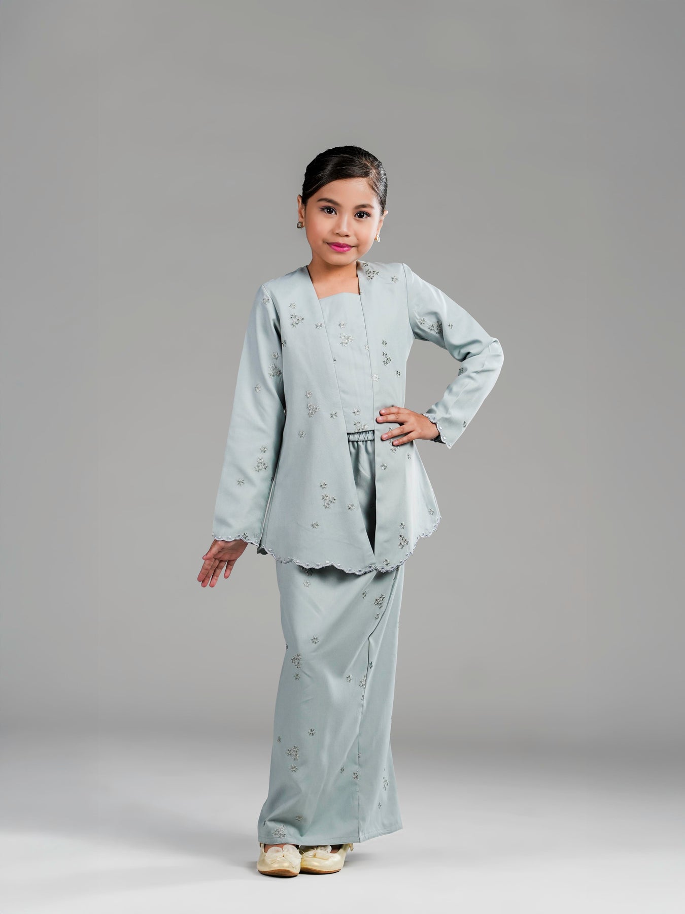Potongan kebaya kutu baru dengan cutting moden mengekalkan siluet kemas, manakala zip di bahagian belakangmemudahkan pemakaian. Kain bawahan potongan kipas belakang direka untuk memberi ruang pergerakan yang selesa serta penampilan yang anggun untuk si kecil tampil manis di pagi Syawal.