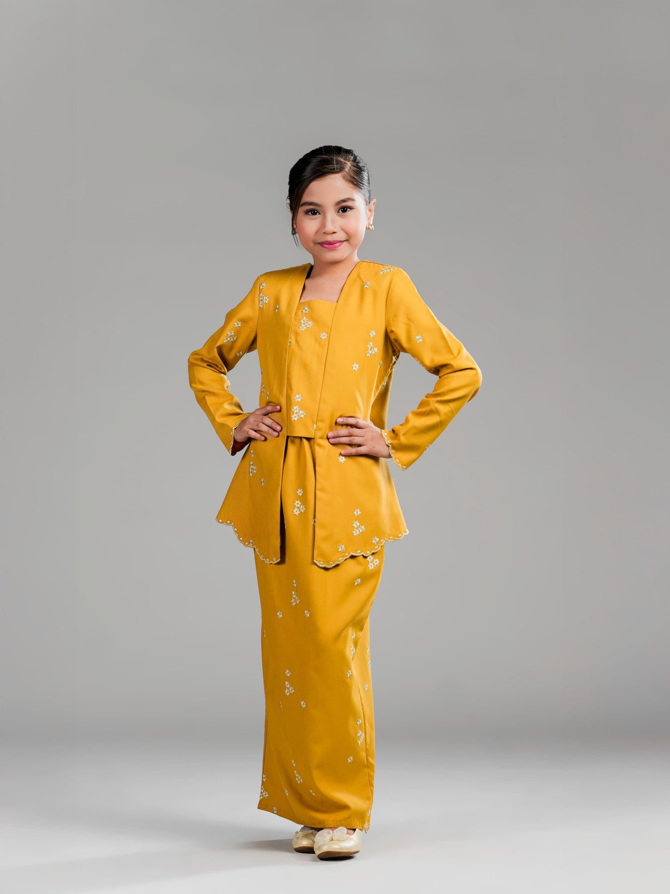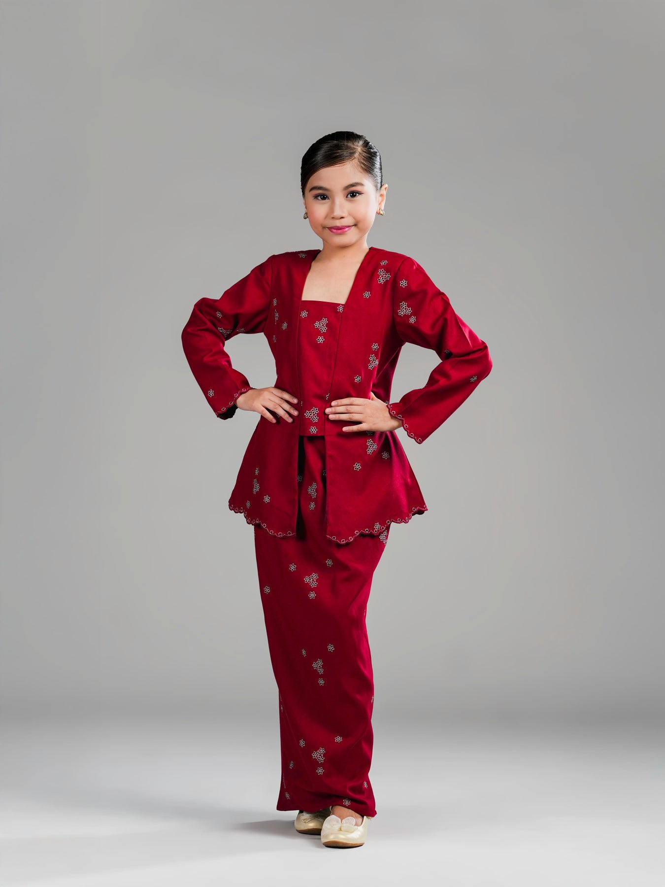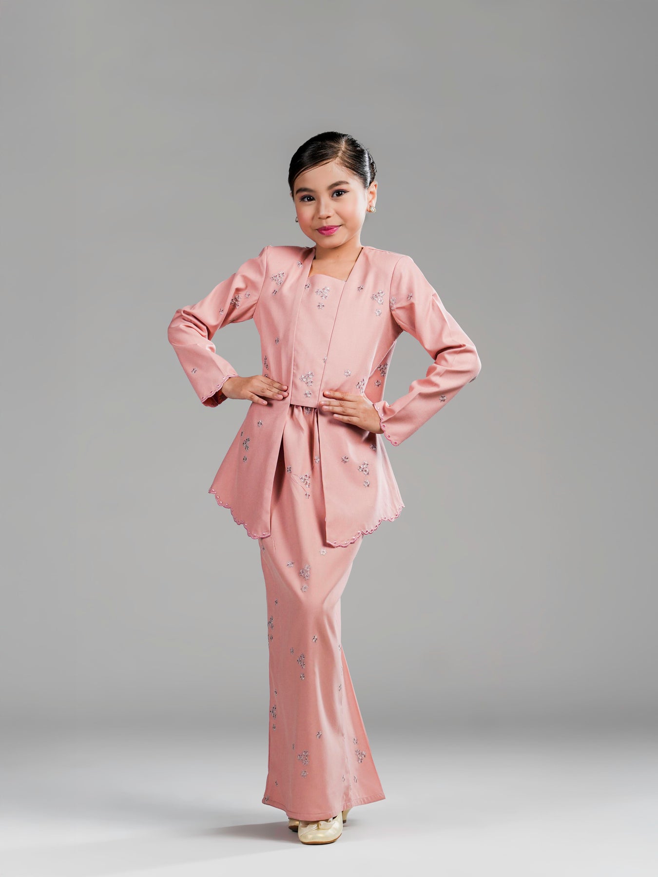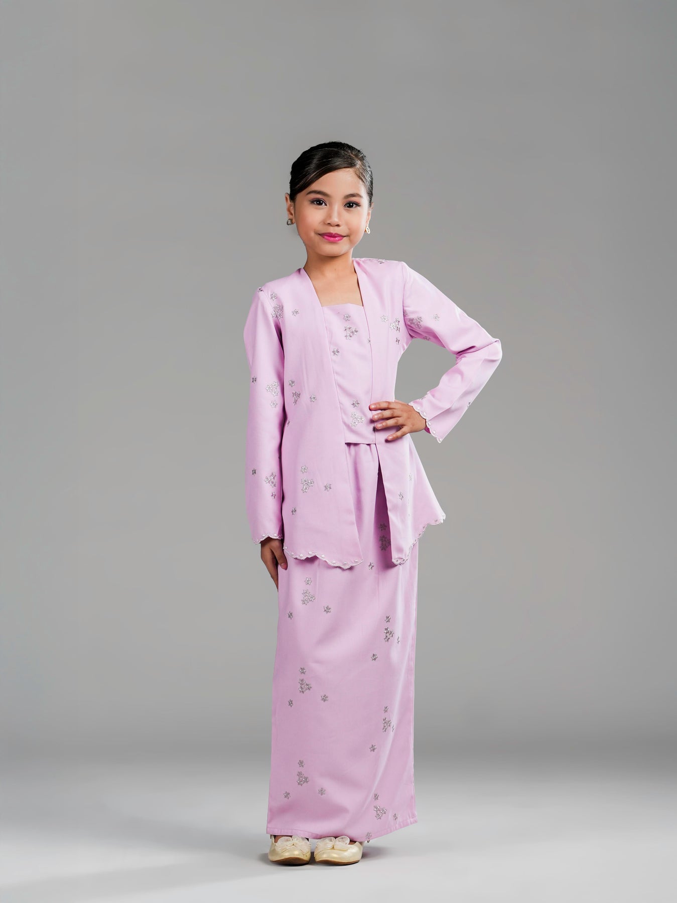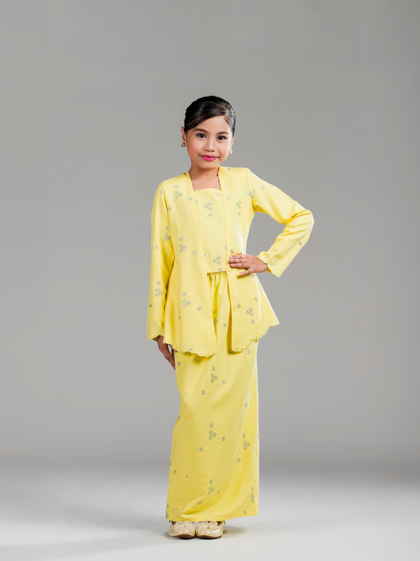 Potongan kebaya kutu baru dengan cutting moden mengekalkan siluet kemas, manakala zip di bahagian belakangmemudahkan pemakaian. Kain bawahan potongan kipas belakang direka untuk memberi ruang pergerakan yang selesa serta penampilan yang anggun untuk si kecil tampil manis di pagi Syawal.